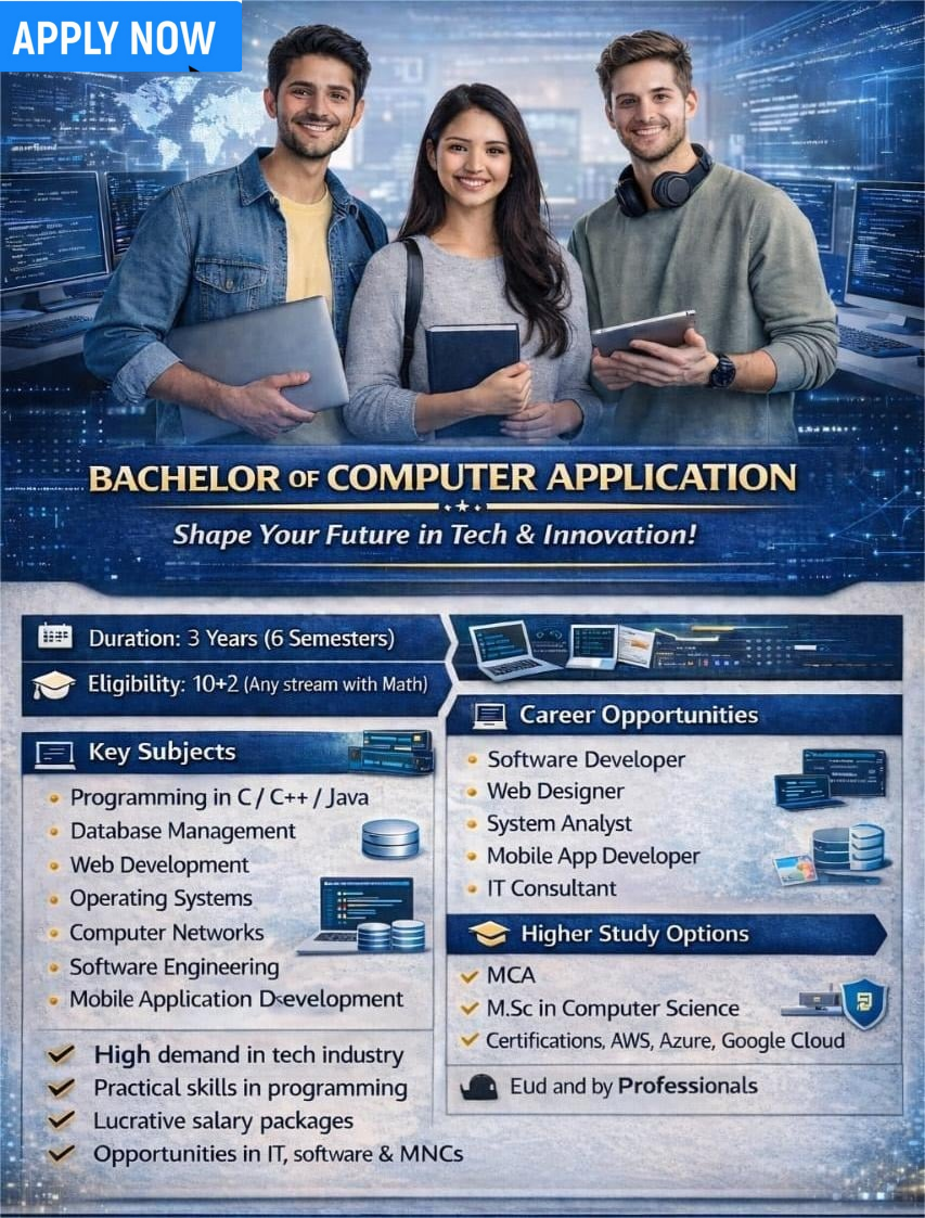 A Bachelor of Computer Applications (BCA) is a 3-year undergraduate degree focused on computer applications, software development, programming (like Java, Python, C++), databases, networking, and web technologies, providing foundational skills for IT careers in roles such as Software Developer, Analyst, or Technical Support, with options for further studies like MCA or MBA. It's a popular alternative to engineering for students wanting a strong practical base in the rapidly growing IT sector after 10+2